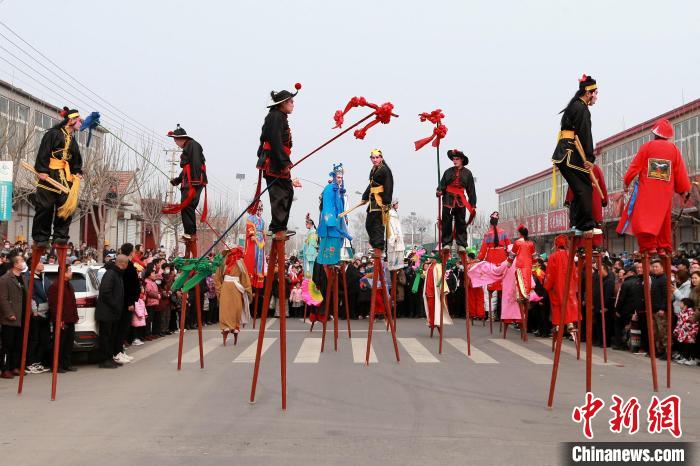 2月13日,元宵節(jié)前夕,民眾在山東濟(jì)南柿子園村觀看濟(jì)南西關(guān)高蹺隊(duì)的精彩表演,賞民俗歡度春節(jié)!×籂 攝