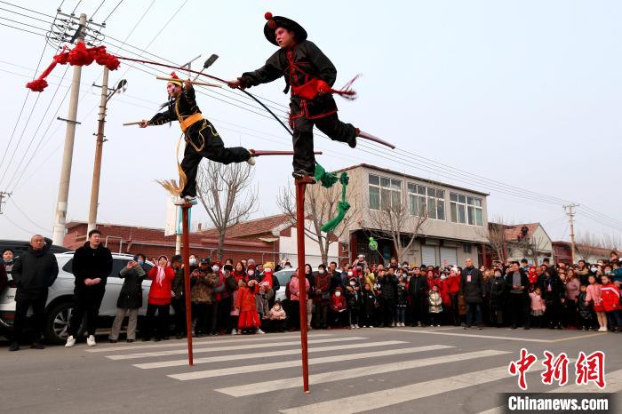 2月13日,元宵節(jié)前夕,民眾在山東濟南柿子園村觀看濟南西關高蹺隊的精彩表演,賞民俗歡度春節(jié)!×籂 攝