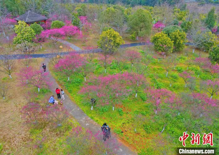 圖為航拍梅花園內(nèi)梅花綻放,不少游客在賞梅!∮萘亮 攝