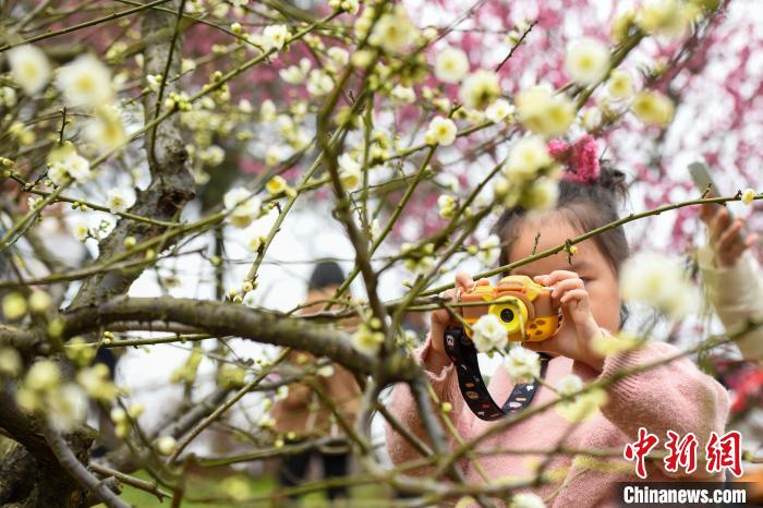 一位小朋友舉起小相機(jī)拍攝梅花!钊A峰 攝
