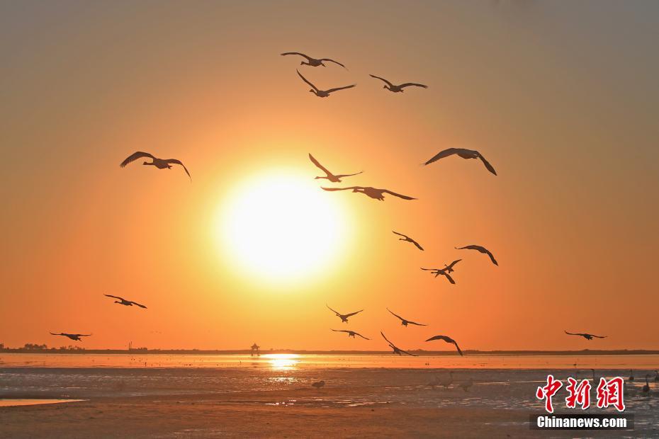 2月27日清晨,成群大天鵝在山東榮成大天鵝國家級自然保護區(qū)天鵝湖畔飛翔。目前,山東榮成大天鵝國家級自然保護區(qū)已進入天鵝遷徙季。據(jù)山東榮成大天鵝國家級自然保護區(qū)工作人員當(dāng)日清晨從各個監(jiān)測點統(tǒng)計的數(shù)字,目前已有1200余只大天鵝開始遷徙。山東榮成是“中國大天鵝之鄉(xiāng)”,在此越冬的大天鵝種群主要遷徙到西伯利亞、蒙古國等地。 中新社發(fā) 王福東 攝 圖片來源:CNSphoto