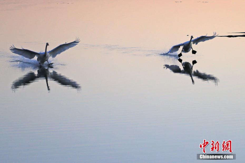 2月27日清晨,2只大天鵝在山東榮成大天鵝國(guó)家級(jí)自然保護(hù)區(qū)天鵝湖畔嬉戲。 中新社發(fā) 王福東 攝 圖片來(lái)源:CNSphoto