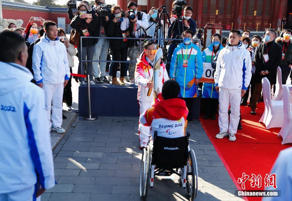 3月2日,北京2022年冬殘奧會(huì)火種匯集儀式在天壇公園舉行。在北京、延慶、張家口三個(gè)賽區(qū)采集的8個(gè)火種,連同在英國(guó)曼德維爾采集的火種,共9個(gè)火種匯聚生成北京2022年冬殘奧會(huì)官方火種。儀式后進(jìn)行了以“九天之火”為主題的天壇公園火炬?zhèn)鬟f。圖為火炬手在現(xiàn)場(chǎng)進(jìn)行交接。 中新社記者 趙雋 攝