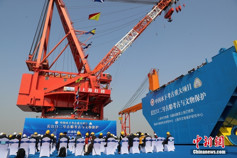 3月2日,中國水下考古發(fā)現(xiàn)的體量最大、保存最為完整、船載文物數(shù)量巨大的木質(zhì)沉船——“長江口二號”古船,正式開始打撈!伴L江口二號”古船考古與文物保護工作同時啟動。中新社記者 張亨偉 攝