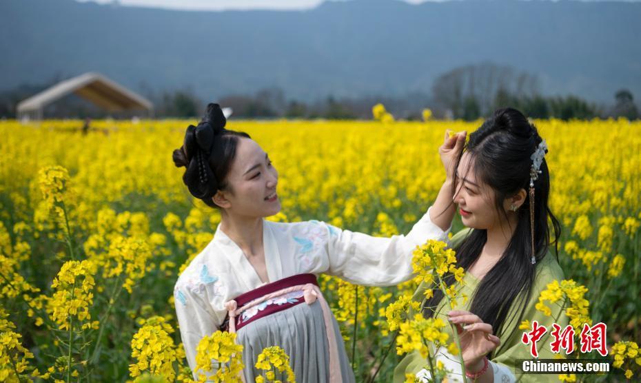 油菜花田里游玩的漢服愛好者。中新社記者 劉忠俊 攝