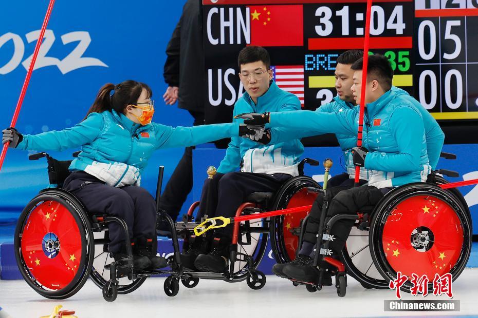 3月8日晚,北京2022年冬殘奧會(huì)輪椅冰壺循環(huán)賽第十一輪比賽在國(guó)家游泳中心舉行,中國(guó)隊(duì)以10比2戰(zhàn)勝美國(guó)隊(duì)。圖為中國(guó)隊(duì)隊(duì)員在比賽中互相鼓勁。 中新社記者 韓海丹 攝