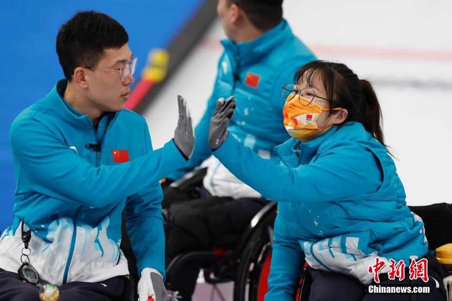 3月8日晚,北京2022年冬殘奧會輪椅冰壺循環(huán)賽第十一輪比賽在國家游泳中心舉行,中國隊以10比2戰(zhàn)勝美國隊。圖為中國隊隊員陳建新與閆卓(右一)在比賽中擊掌慶祝。 中新社記者 韓海丹 攝