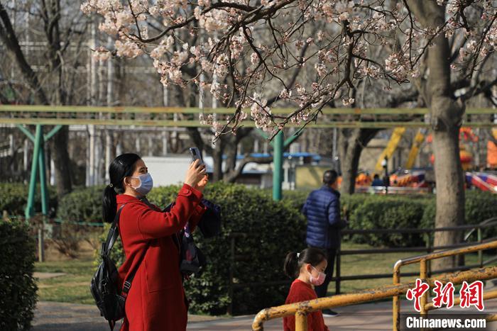 市民在櫻桃花樹下拍照!∴囆(qiáng) 攝