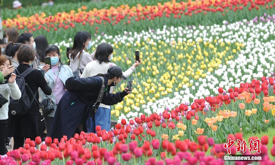 3月18日,游客觀賞郁金香。近日,約40萬(wàn)株郁金香在浙江杭州西湖邊次第開(kāi)放,美麗春景吸引游客。 中新社記者 王剛 攝