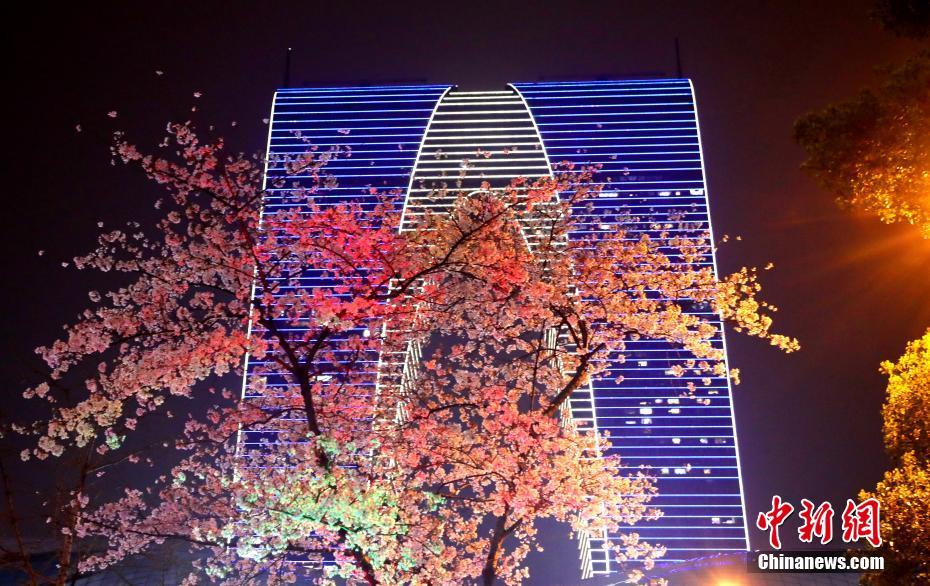 2022年3月22日,江蘇蘇州,綻放的櫻花與當(dāng)?shù)貥?biāo)志性建筑——東方之門“同框”,吸引市民夜賞櫻花,拍照留影。中新社發(fā) 王建中 攝 圖片來源:CNSphoto