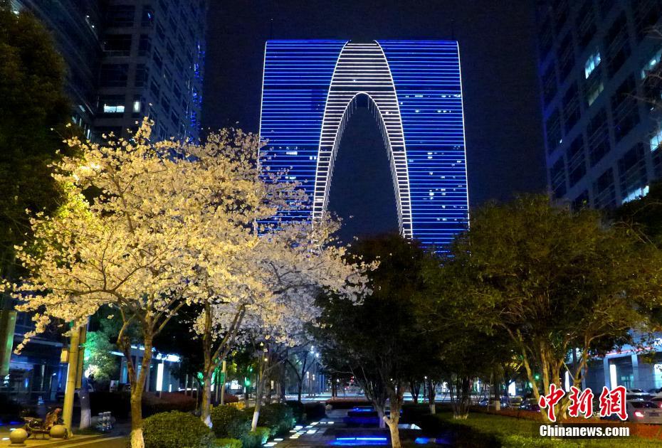 3月22日,江蘇蘇州,綻放的櫻花與當(dāng)?shù)貥酥拘越ㄖ獤|方之門“同框”,吸引市民夜賞櫻花,拍照留影。中新社發(fā) 王建中 攝 圖片來源:CNSphoto