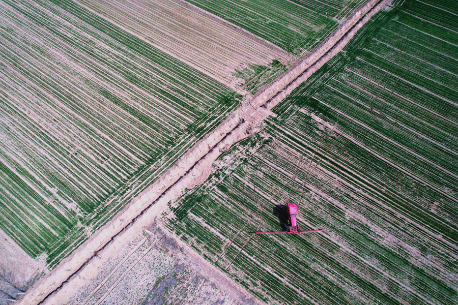 3月23日,山東濟南章丘區(qū)黃河街道,臂展20余米的自走式打藥車正在黃河岸邊的麥田里噴灑除草劑。隨著氣溫回暖,山東各地農(nóng)民正緊張地組織春耕春管,黃河岸邊的麥田里一片繁忙。(無人機拍攝)