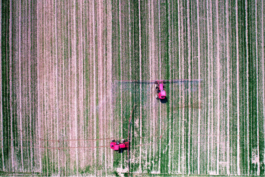 3月23日,山東濟(jì)南章丘區(qū)黃河街道,臂展20余米的自走式打藥車(chē)正在黃河岸邊的麥田里噴灑除草劑。隨著氣溫回暖,山東各地農(nóng)民正緊張地組織春耕春管,黃河岸邊的麥田里一片繁忙。(無(wú)人機(jī)拍攝)