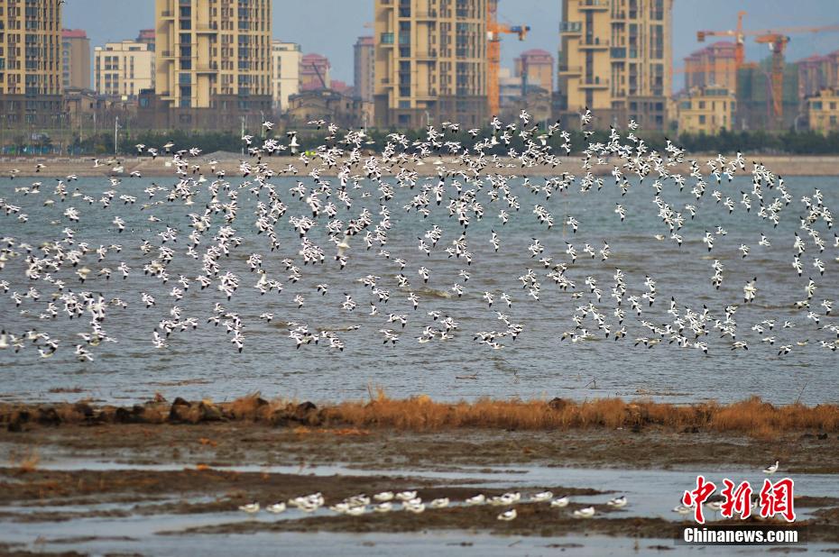 近日,成群反嘴鷸飛抵山東省青島市城陽區(qū)紅島前陽灘涂,準(zhǔn)備度夏繁殖。近年來,當(dāng)?shù)丶哟蠛0稙┩恐卫,清除互花米草、平整灘涂,為遷徙候鳥提供了理想的棲息環(huán)境。王海濱 攝