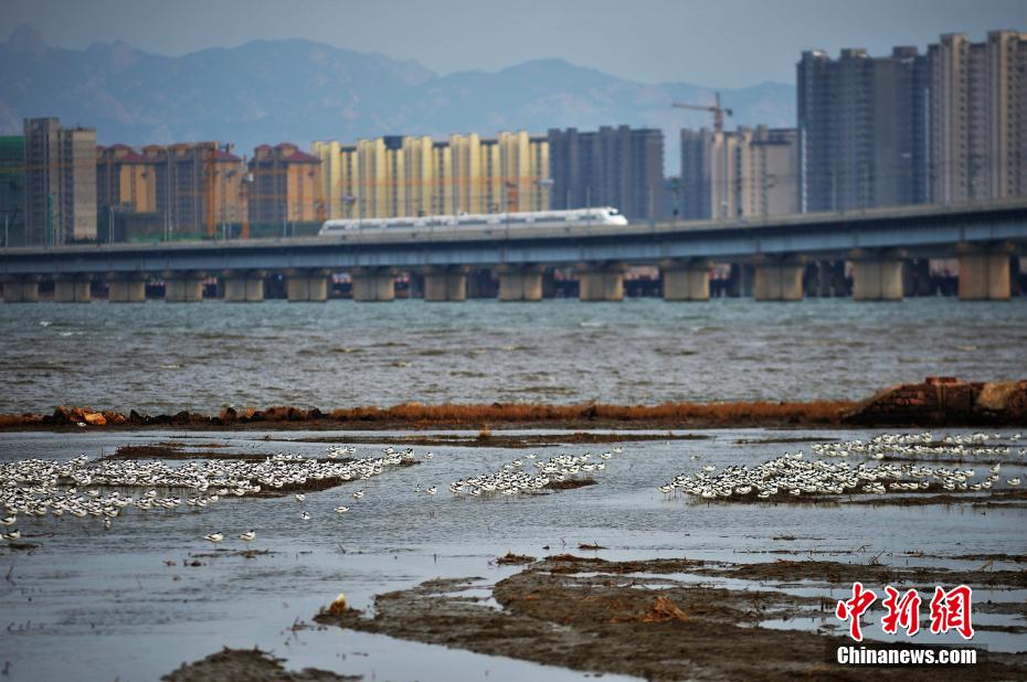 成群鷸鳥飛抵山東青島海岸(3)