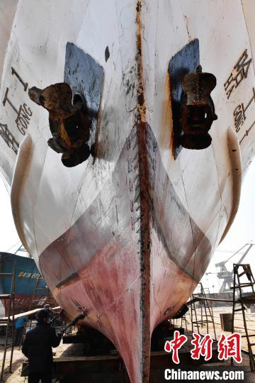 工人為漁船除銹迎接春鲅魚汛期!⊥鹾I 攝