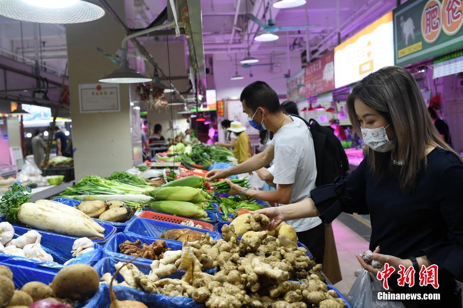 4月9日,廣州開展全員核酸檢測(cè)。疫情防控關(guān)鍵時(shí)期,不少抱著有備無患心態(tài)的市民到當(dāng)?shù)夭耸袌?chǎng)和商超購買生活必需品。記者走訪多個(gè)市場(chǎng)和超市發(fā)現(xiàn),雖然許多市民購買量比平時(shí)大,但商家源源不斷補(bǔ)貨,物價(jià)平穩(wěn),“老廣”們淡定購物。圖為市民在一菜市場(chǎng)選購蔬菜。 中新社記者 陳楚紅 攝