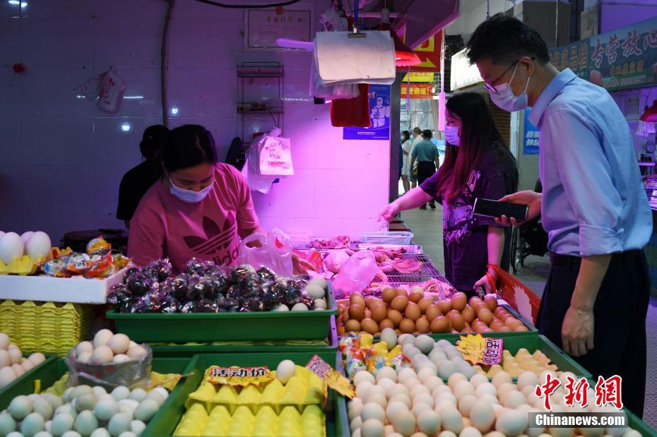 4月9日,廣州開展全員核酸檢測(cè)。疫情防控關(guān)鍵時(shí)期,不少抱著有備無患心態(tài)的市民到當(dāng)?shù)夭耸袌?chǎng)和商超購(gòu)買生活必需品。記者走訪多個(gè)市場(chǎng)和超市發(fā)現(xiàn),雖然許多市民購(gòu)買量比平時(shí)大,但商家源源不斷補(bǔ)貨,物價(jià)平穩(wěn),“老廣”們淡定購(gòu)物。圖為市民在一菜市場(chǎng)選購(gòu)肉類。 中新社記者 陳楚紅 攝