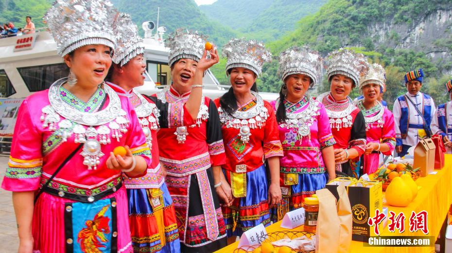 在廣西桂林市靈川縣漓江沿岸楊堤碼頭,身穿少數(shù)民族服飾的婦女們用山歌歌頌當?shù)氐奶厣r(nóng)產(chǎn)品。 楊宗盛 攝