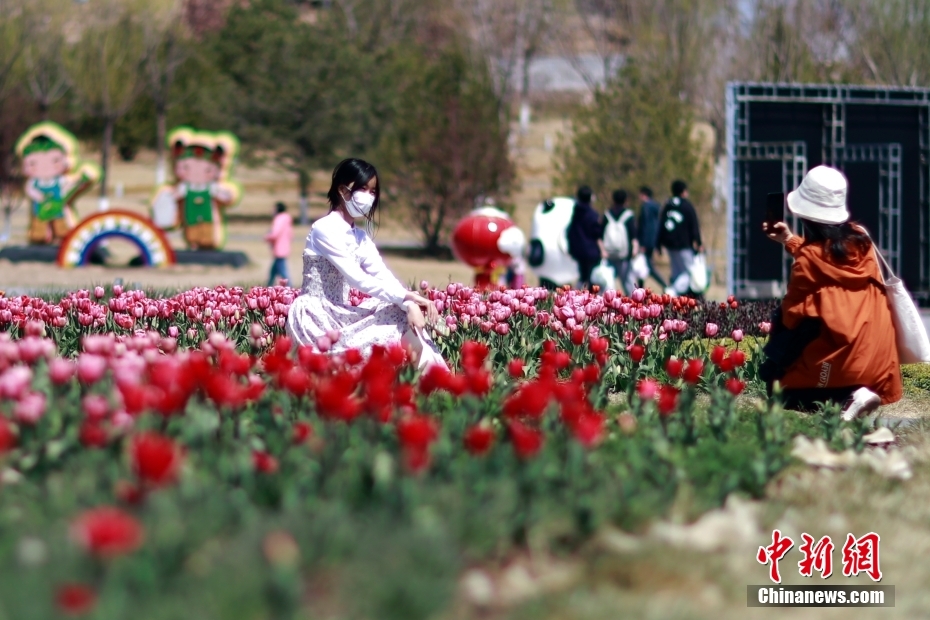4月16日,市民在北京世園公園郁金香花叢中拍照。北京世園公園里的30萬(wàn)株郁金香陸續(xù)進(jìn)入盛花期,吸引不少市民賞花“打卡”。 中新社記者 盛佳鵬 攝