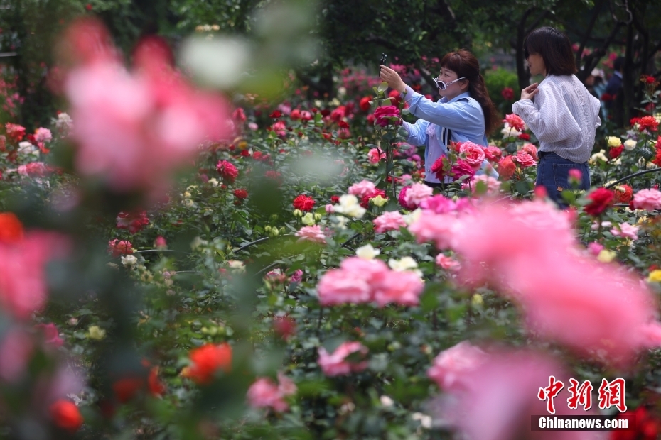 4月27日,江蘇南京玄武湖畔月季花盛開,花團(tuán)錦簇引客來。圖為市民前來欣賞月季花。中新社記者 泱波 攝