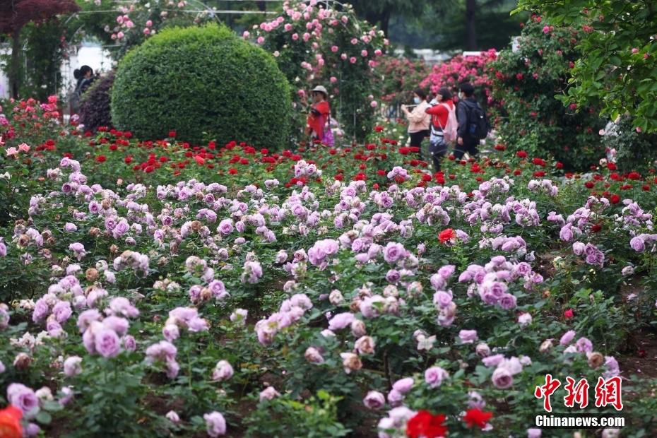 4月27日,江蘇南京玄武湖畔月季花盛開(kāi),花團(tuán)錦簇引客來(lái)。圖為市民前來(lái)欣賞月季花。中新社記者 泱波 攝