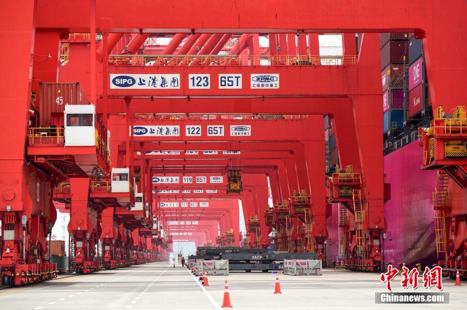 4月27日,上海洋山深水港,岸橋起重機(jī)正在裝卸貨物。在上海洋山深水港的四期自動(dòng)化碼頭,“ONE WREN”號(hào)國(guó)際集裝箱船正在裝卸貨物。 中新社記者 田雨昊 攝