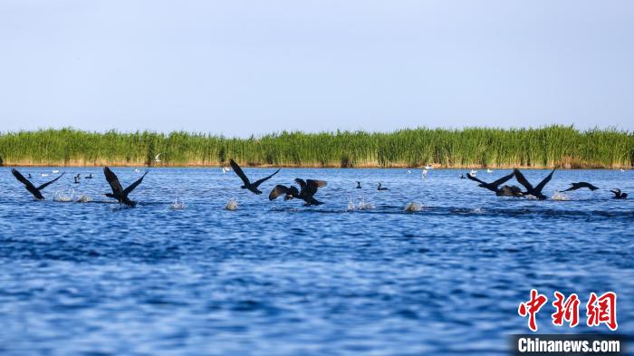 初夏,位于新疆巴音郭楞蒙古自治州博湖縣境內(nèi)的博斯騰湖濕地迎來(lái)了鳥類繁殖季,這里水草豐茂,碧綠的蘆葦蕩里成群的水鳥時(shí)隱時(shí)現(xiàn),廣闊的淺灘上成群的鸕鶿戲水覓食,碧水、藍(lán)天、蘆葦、各類水禽鳥類相映成景,構(gòu)成了一幅美麗的自然生態(tài)畫卷。年磊 攝
