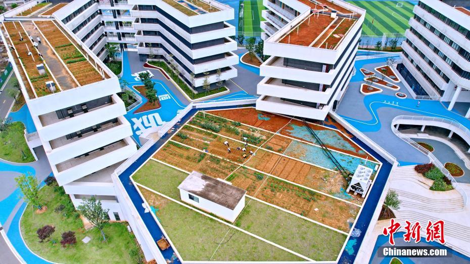 圖為無人機(jī)航拍學(xué)校建筑樓頂?shù)囊粔K塊“空中菜園”,學(xué)生在其中勞作。 朱海鵬 攝