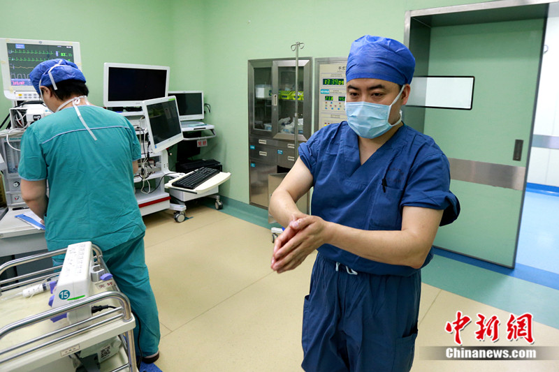 5月11日,山東濟(jì)南,一名男性護(hù)士手部消毒后走進(jìn)手術(shù)室。第111個(gè)國際護(hù)士節(jié)來臨之際,中國國家衛(wèi)健委當(dāng)天發(fā)布消息稱,截至2021年底,中國護(hù)士隊(duì)伍發(fā)展到501.8萬,比2012年增加了約252萬人,增幅達(dá)到101%。其中,男性護(hù)士的比例占3%,2012年為1.8%。 中新社記者 梁犇 攝