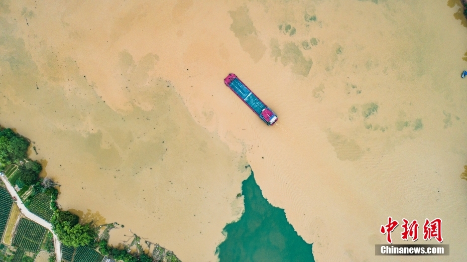 5月21日,廣西南寧江南區(qū)江西鎮(zhèn)同江村,地處左江、右江、邕江交匯處的三江口因左江上游連日強降雨,江水呈黃色,與右江綠色的江水交匯出現(xiàn)“涇渭分明”景觀。中新社發(fā) 彭寰 攝 圖片來源:CNSphoto
