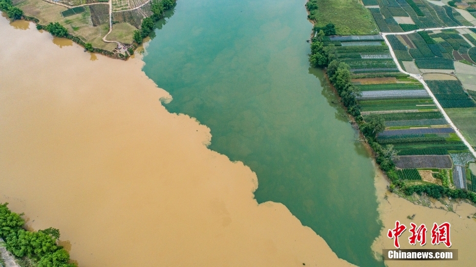 5月21日,廣西南寧江南區(qū)江西鎮(zhèn)同江村,地處左江、右江、邕江交匯處的三江口因左江上游連日強降雨,江水呈黃色,與右江綠色的江水交匯出現(xiàn)“涇渭分明”景觀。中新社發(fā) 彭寰 攝 圖片來源:CNSphoto