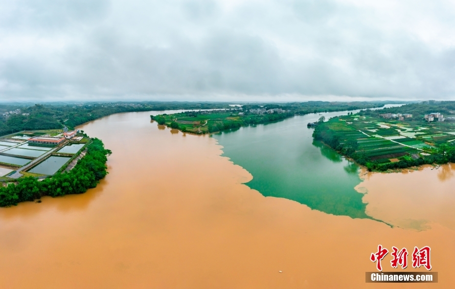 5月25日,廣西南寧市江西鎮(zhèn)同江村三江口出現(xiàn)“鴛鴦江”景觀。因連日的強(qiáng)降雨天氣,廣西左右江一黃一綠,在同江村三江口匯合處,南寧市母親河邕江的源頭形成了涇渭分明的獨(dú)特景觀。中新社發(fā) 王光強(qiáng) 攝 圖片來源:CNSphoto