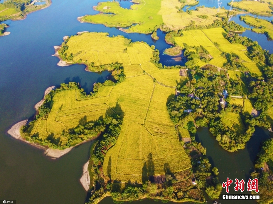 10月3日,金秋時節(jié),安徽省蕪湖市弋江區(qū)火龍街道新聯(lián)村數(shù)千畝水稻陸續(xù)成熟,田間地頭一片金黃,豐收在望。從空中俯瞰,湖泊、道路、村莊和金黃的稻田繪制成一幅美麗的江南水鄉(xiāng)金色田園畫卷。 圖片來源:ICphoto