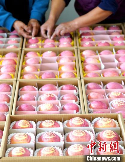 農(nóng)民在包裝印字蘋果!∫ 攝