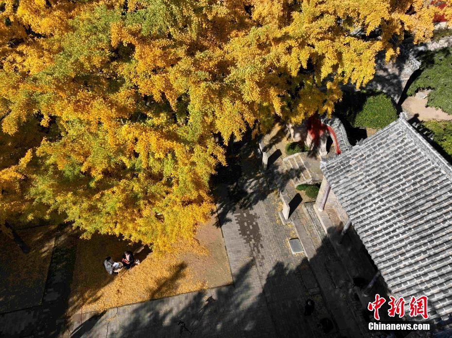 嗅著古寺內(nèi)沁人心脾的禪香,置身千年銀杏樹下,仿佛時(shí)間穿越到那古老的年代,如夢如幻。(無人機(jī)照片) 劉文浩 攝