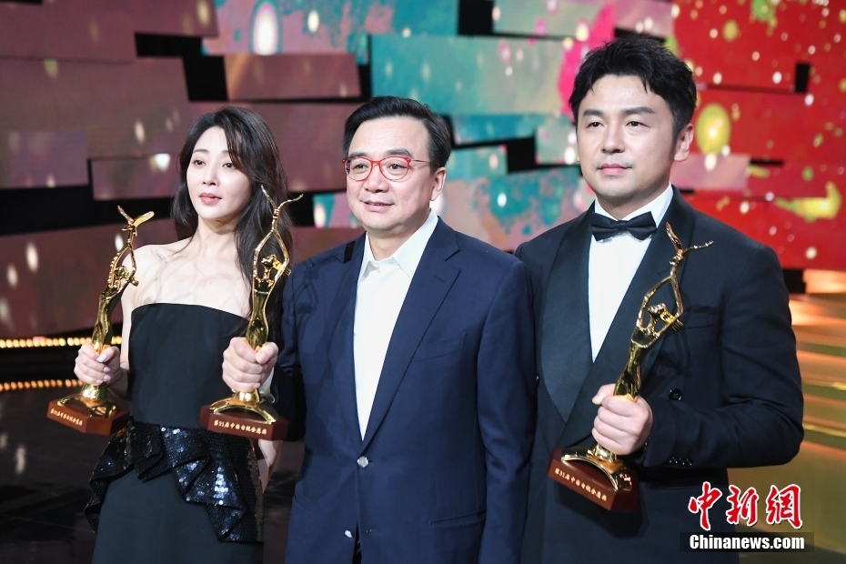 11月6日,獲獎(jiǎng)人員舉起獎(jiǎng)杯合影。當(dāng)晚,第31屆中國(guó)電視金鷹獎(jiǎng)?lì)C獎(jiǎng)典禮在湖南長(zhǎng)沙舉行,演員雷佳音(右一)、殷桃(左一)分獲最佳男、女主角獎(jiǎng),李路(中)獲最佳電視劇導(dǎo)演獎(jiǎng)。 中新社記者 楊華峰 攝