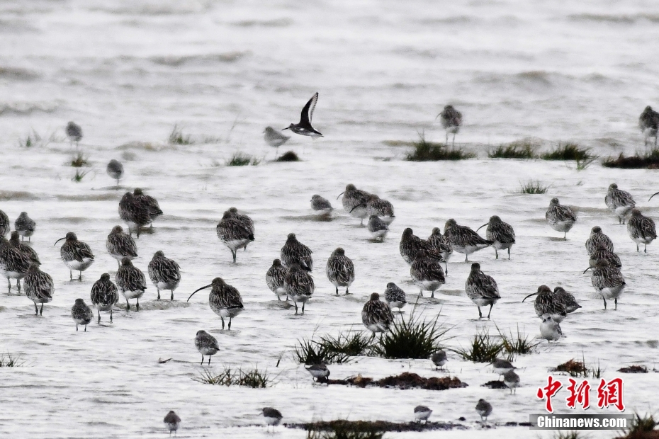 11月6日,在山東省青島市膠州灣海洋公園河套段濱海濕地,成群白腰杓鷸在岸邊棲息。隨著候鳥遷徙進入高峰時段,膠州灣海洋公園濱海濕地迎來翹鼻麻鴨、黑腹濱鷸、白腰杓鷸等數(shù)萬只候鳥遷徙過境駐留,場面壯觀。 中新社發(fā) 王海濱 攝