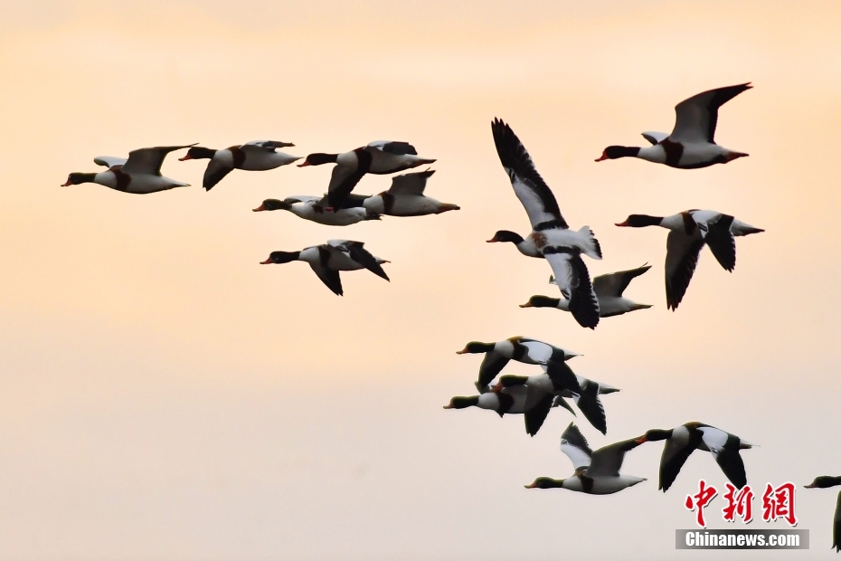 11月6日,在山東省青島市膠州灣,成群翹鼻麻鴨陸續(xù)飛抵越冬。隨著候鳥遷徙進入高峰時段,膠州灣海洋公園濱海濕地迎來翹鼻麻鴨、黑腹濱鷸、白腰杓鷸等數萬只候鳥遷徙過境駐留,場面壯觀。 中新社發(fā) 王海濱 攝