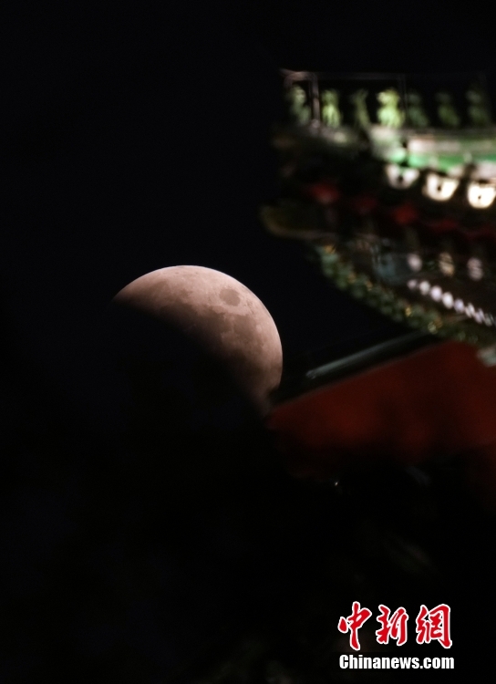 11月8日,在北京前門大街附近拍攝的月食。2022年度最值得期待的重磅天象——月全食于當(dāng)日晚間登場(chǎng),中國大部分地區(qū)都可看到全食階段。 中新社記者 毛建軍 攝