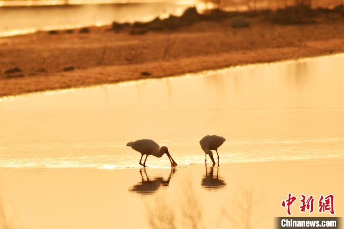 兩只琵嘴鷺在水中覓食。 王海濱 攝