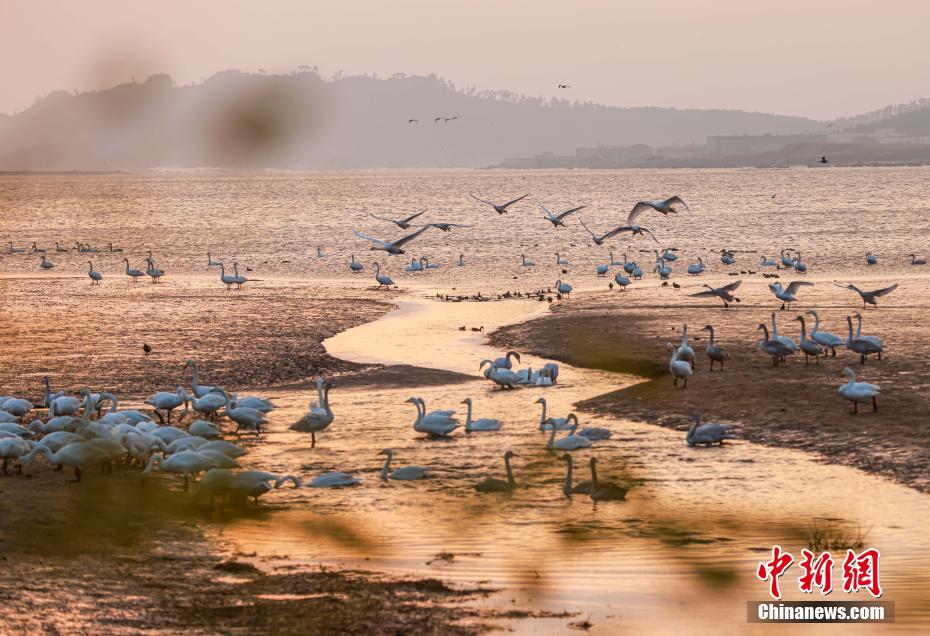 5000余只大天鵝飛抵山東榮成越冬棲息