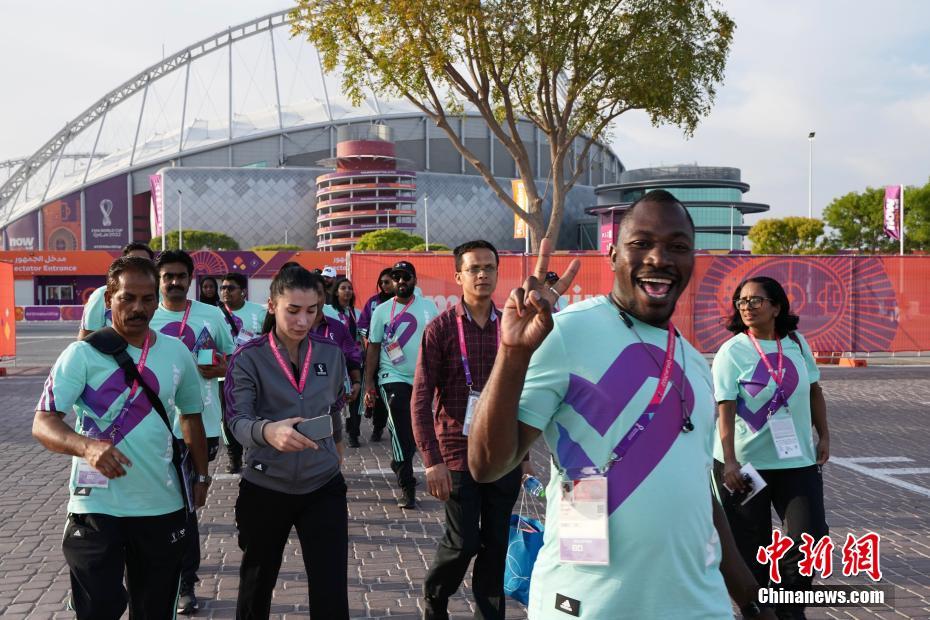 當(dāng)?shù)貢r(shí)間11月17日,卡塔爾多哈,哈里發(fā)國(guó)際體育場(chǎng)外的世界杯志愿者們。 中新社記者 崔楠 攝