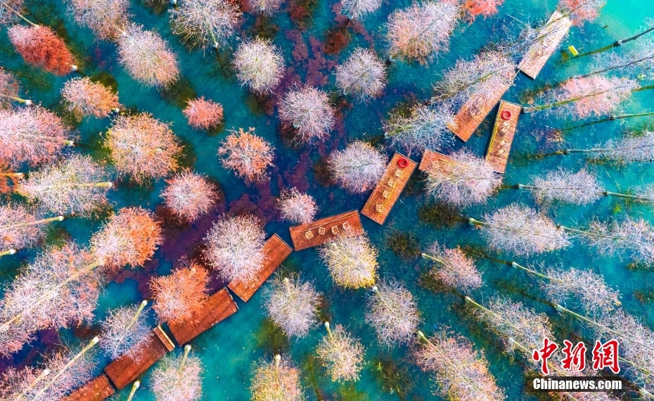 11月25日,江蘇省宿遷市泗洪縣洪澤湖濕地景區(qū)臨淮段水杉林色彩斑斕,與碧綠的湖水相映成趣,如夢似幻。 中新社發(fā) 張連華 攝 圖片來源:CNSphoto