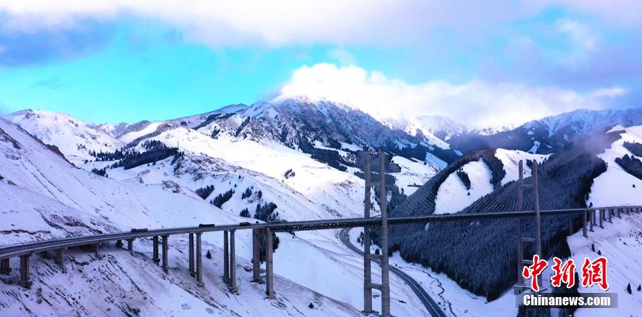 著名的新疆霍城縣果子溝大橋猶如巨龍盤(pán)旋在白雪皚皚的山間。 曾雨薇 攝