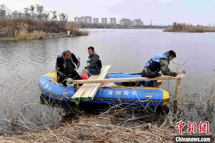 志愿者為候鳥安放棲息捕魚木樁!⊥鹾I 攝
