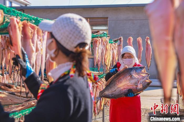 當(dāng)?shù)厝擞煤K畬Ⅳ~沖洗干凈,掛在架子上晾曬,具有濃郁的地方特色和海洋風(fēng)味!±钚啪 攝