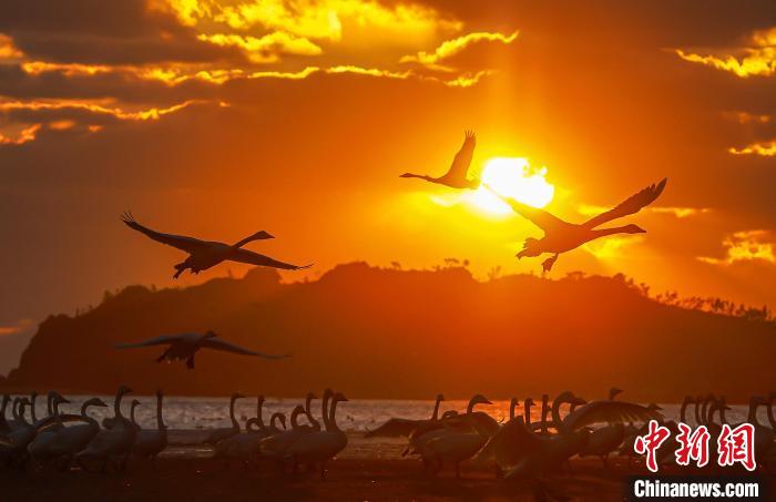 山東榮成現(xiàn)彩霞與天鵝齊飛美景。 李信君 攝