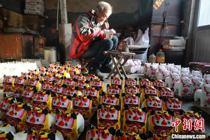 2022年12月12日,山東省高密市聶家莊村民張清先正在家中制作“泥叫虎”!±詈 攝