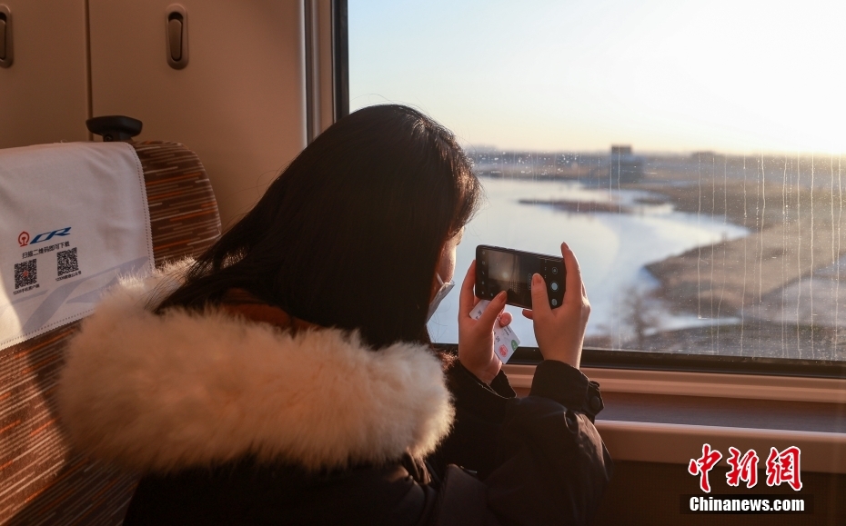 12月26日,G891次列車內(nèi),旅客拍攝車窗外的冬日景色。中新社記者 賈天勇 攝